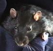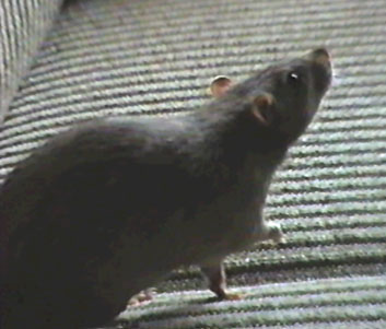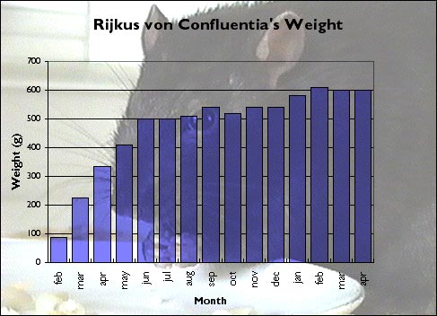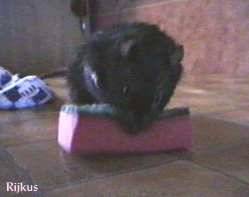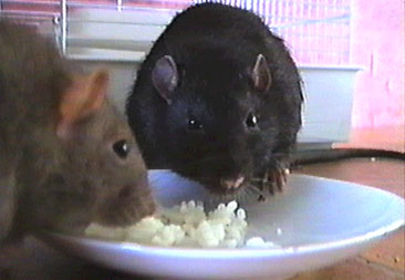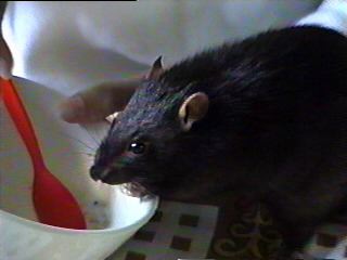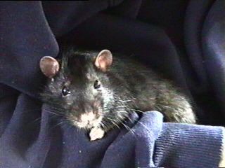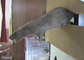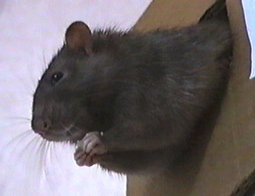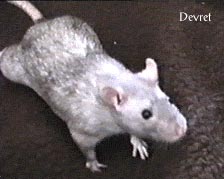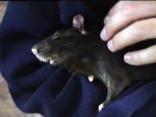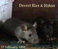 It was a cold rainy February morning when a VB team member entered that small apartment in one of the lower districts of Amsterdam (The Netherlands). Two of the rats there would be the future official VB mastcots, but which of the 70 rats packed into tiny cages would they be? The decision was not to be hers. Two small rats had already been pre-selected and sat huddled in a tiny plastic carrying cage, awaiting their fate. Their pedigree papers had already been filled in, except for their names. And so, with that small detail completed, the four-week old Rijkus ("ray-kus") von Confluentia, the little black rat with a sprinkling of silver hairs, and his brother Devret Ries von Confluentia, a complex mixture of mink and mocca colors, had a new home.